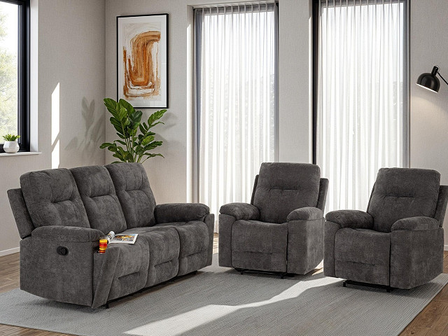 guilford 3+1+1 recliner set in grey fabric, sizes 3 seater w2050mm x d940mm-1650mm x h1040mm, chair w900 x d940mm-1650mm x h1040mm